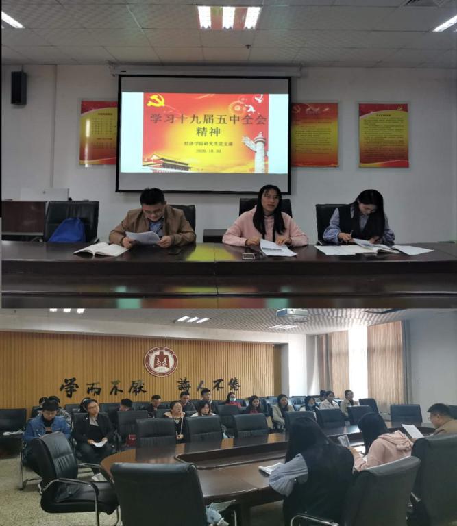 高桂爱首先传达了学习党的十九届五中全会精神,并带领全体党员了集中学习《中国共产党第十九届委员会第五次全体会议公报》,与会党员充分讨论,对会议精神有了深刻的领会:这次全会站在“两个一百年”奋斗目标的历史交汇点,擘画发展蓝图、规划实践路径、作出战略部署,为夺取全面建设社会主义现代化国家新胜利注入强大思想和行动力量。作为研究生党员,我们要把学习贯彻十九届五中全会精神作为当前和今后一个时期的首要政治任务,要突出专业特色,重点关注全会报告中关于经济方面的新理论、新提法、新目标,以这些新理论、新提法、新目标为指引,进行学术研究和实操工作。
