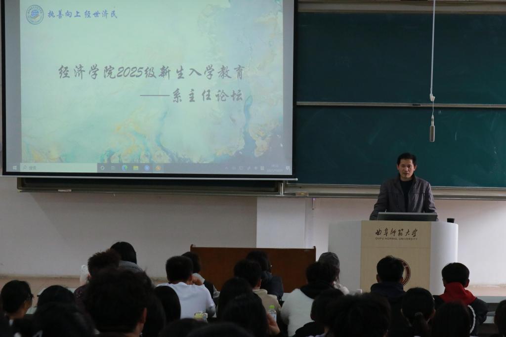曲阜师大经济学院新闻中心讯(通讯员:李月晴 刘铭涵 摄影:刘铭涵 李月晴)为切实推进2025级新生入学教育工作,助力新生把握专业脉络、明晰发展路径,10月23日-29日,经济学院2025级新生系主任论坛于S415、A106、A304教室顺利举行,本次论坛由金融工程系老师潘超、经济系副主任王亚萌、国际经济与贸易系主任邹宗森主讲,经济学院2025级全体本科生参加。